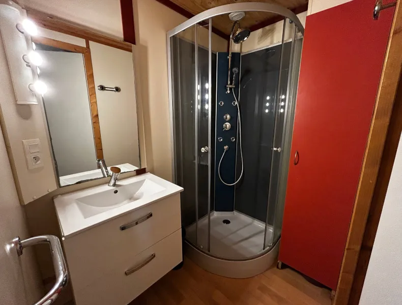 Pensé pour le bien-être de chacun, le Chalet Méditerranée offre un salon spacieux avec table, chaises et canapé convertible. L’espace nuit comprend une chambre parentale avec lit double et une seconde chambre dotée de deux lits simples, parfaite pour les enfants. La salle d’eau dispose d’une douche et d’un lavabo, tandis que les WC sont séparés pour plus de confort. L’agencement du chalet permet de profiter d’un espace de vie agréable, baigné de lumière naturelle.