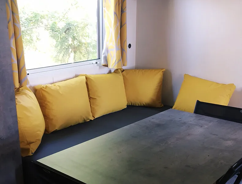 La terrasse du Mobil-home Capelado est un véritable espace de vie supplémentaire. Aménagée avec une table forestière, elle permet de profiter de repas en plein air, de moments de détente ou de soirées conviviales sous le ciel méditerranéen.