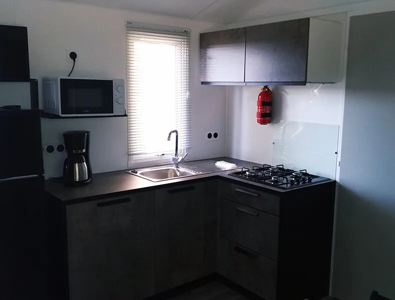 Spacieux et fonctionnel, ce mobil-home dispose d’un salon central accueillant avec table, chaises et canapé convertible, parfait pour les moments de détente. La cuisine ouverte, équipée de tout le nécessaire, facilite les repas en famille. Côté nuit, une chambre parentale avec lit double et deux chambres enfants avec lits simples garantissent à chacun son espace de repos. La salle d’eau avec douche et lavabo, ainsi que les WC séparés, complètent cet agencement harmonieux.