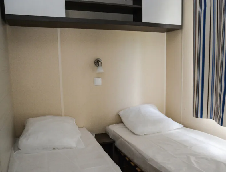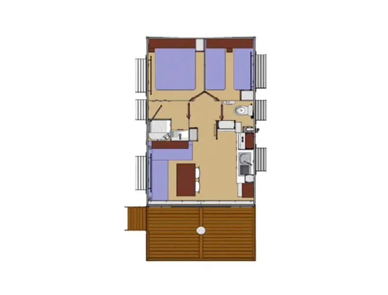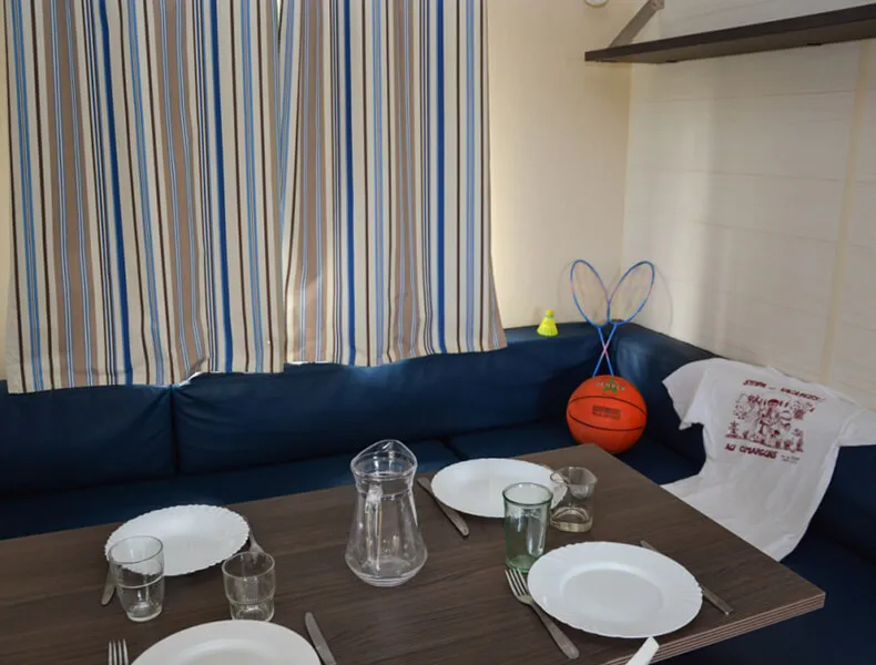 Conçu pour allier praticité et confort, le Mobil-home Abrivado dispose d’un salon central accueillant avec table, chaises et canapé convertible. La cuisine ouverte, entièrement équipée, permet de préparer facilement les repas.